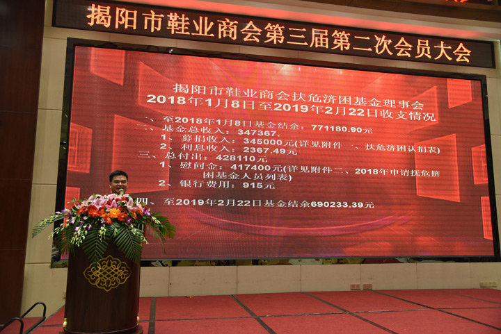 陽(yáng)春三月,百花盛開(kāi)。在舉國(guó)上下歡慶全國(guó)兩會(huì)勝利召開(kāi)的喜慶日子里。2019年3月31日,揭陽(yáng)市鞋業(yè)商會(huì)第三屆第二次會(huì)員大會(huì)在揭陽(yáng)迎賓館舉行。揭陽(yáng)市工商業(yè)聯(lián)合會(huì)、揭陽(yáng)市社會(huì)組織管理局、揭陽(yáng)市工業(yè)和信息化局、揭陽(yáng)市商務(wù)局、揭陽(yáng)市社會(huì)組織總會(huì)、榕城區(qū)工信和商務(wù)局等部門(mén)領(lǐng)導(dǎo);以及揭陽(yáng)市建筑裝飾協(xié)會(huì)、揭陽(yáng)市不銹鋼制品協(xié)會(huì)、揭陽(yáng)市北大工商管理碩士企業(yè)家協(xié)會(huì)、揭陽(yáng)市機(jī)電模具協(xié)會(huì)、揭陽(yáng)市登山協(xié)會(huì)、揭陽(yáng)市投資協(xié)會(huì)、揭陽(yáng)市電子商務(wù)協(xié)會(huì)等兄弟協(xié)會(huì)的代表和商會(huì)會(huì)員代表共一百二十多人出席了會(huì)議。